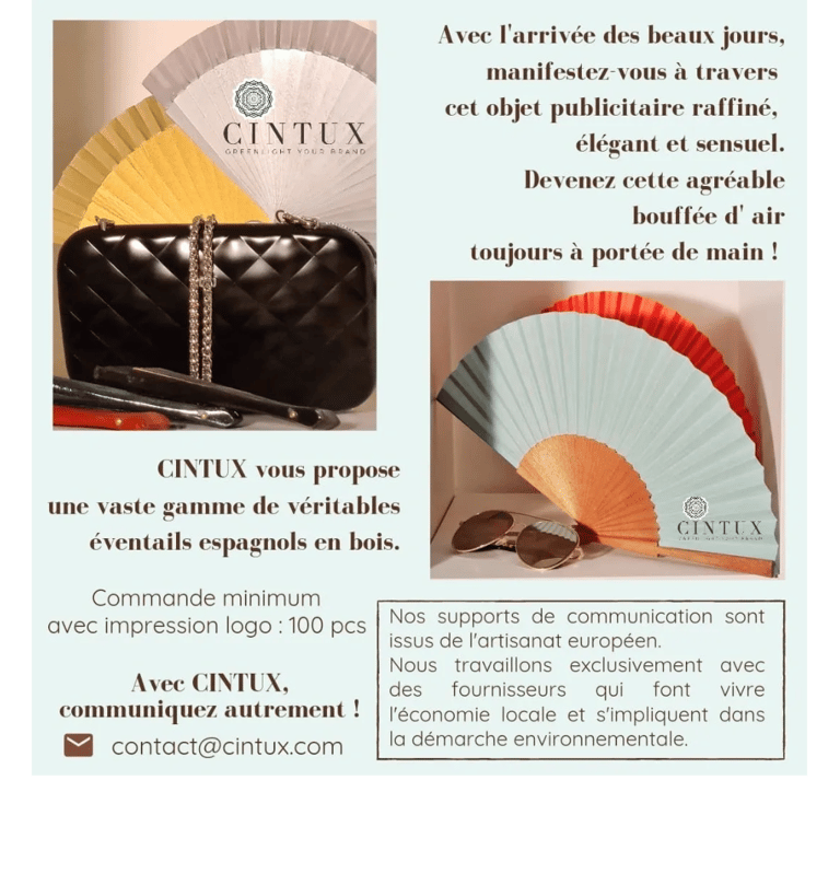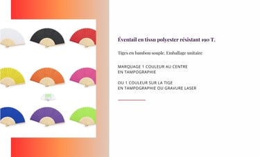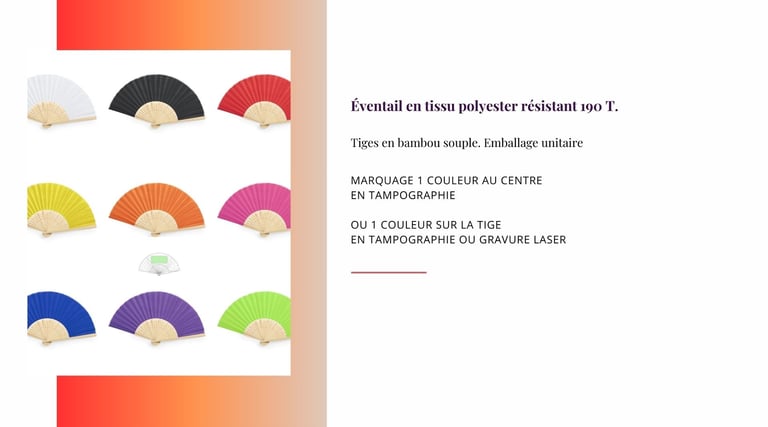 En plus d’être léger et facile à transporter, l’éventail devient un support publicitaire original et raffiné, parfait pour se faire remarquer lors des journées ensoleillées, événements ou festivals.